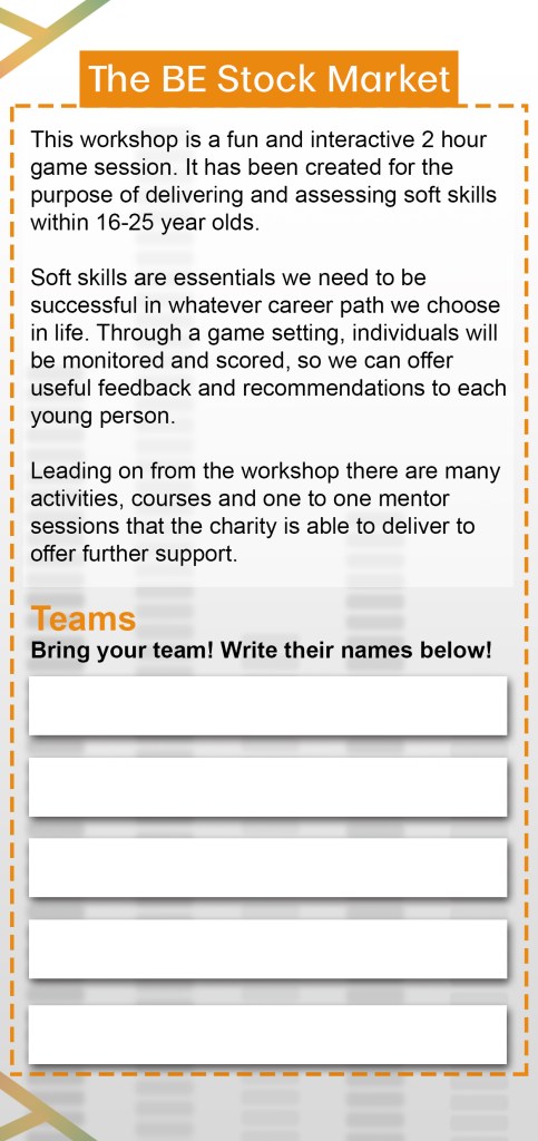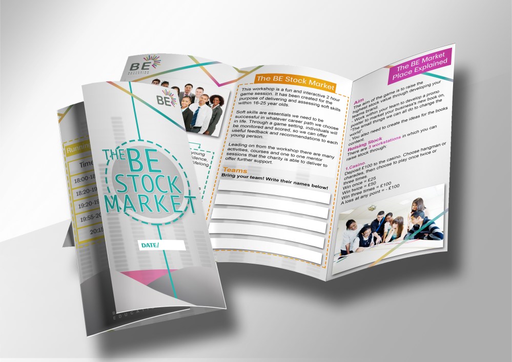 I was asked to create this leaflet to help spread the word for a Stock market workshop event that BE were putting on and here are the results. You can view the different pages created below.