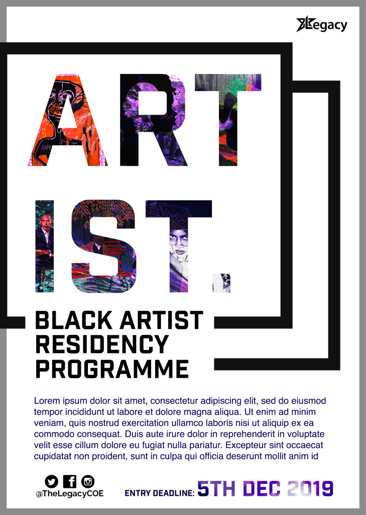 This flyer design would be used via social media channels to advertise the possibility of having their work displayed for free inside of Europes largest black owned event space.